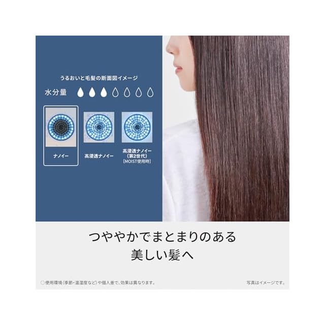 うるおいたっぷりのナノイーが毛髪に水分を与え、なめらかな指通りへ。