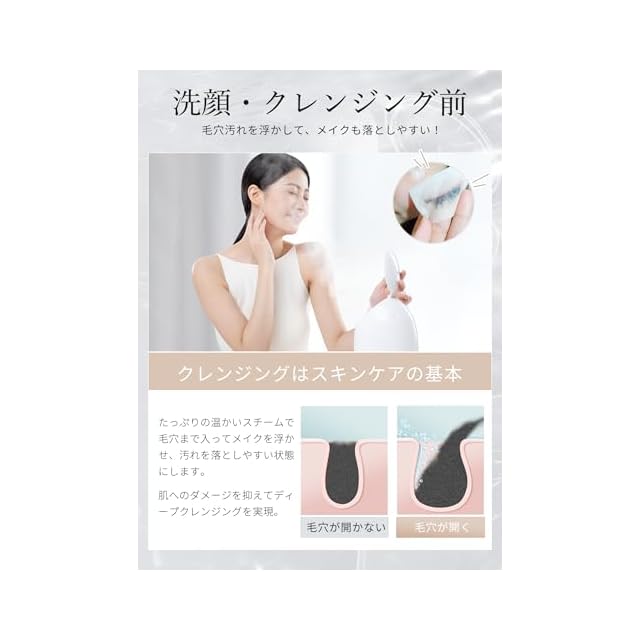 【微粒化技術/ワイド濃密スチーム】ナノは1mmの10億分の1の細かい粒子。普通のスチームと比べて格段にキメが細かいので肌への浸透力も高い!瞬時にナノ化された水分子がお肌の奥にまで届く、毛穴を開くことで詰まった角栓や汚れを落とし、洗浄効果を高め基礎化粧品の浸透率をアップさせてくれる美顔スチーマーです。