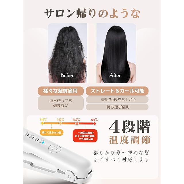 【4段階の温度調節】140℃/160℃/180℃/200℃の4段階の温度調節が可能。前髪をセットする際にヘアアイロンを使う場合は120~140℃、カールスタイルを楽しむなら140℃前後、きれいなストレートヘアを実現したい方は160℃~200℃といったように、髪の硬さや用途、髪の傷み具合に合わせて温度を変更可能です。髪をいたわりながら使いたい方も注目しておきたい機能です。