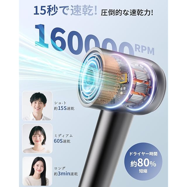 【革命的な15秒速乾でスタイリング時間を半減!】1300W高出力モーターと毎分16万回転の超高速設計で、従来のドライヤーよりも乾燥時間を約80%も短縮。通勤前のスタイリングや入浴後の乾燥など、忙しい朝にもしっかり対応。高温に頼らない高風速技術で、髪の根元から素早く乾かし、表面の水分を効率的に除去。熱ダメージを大幅軽減しながら、低音運転(50dB以下)で家族の安眠を邪魔しません。