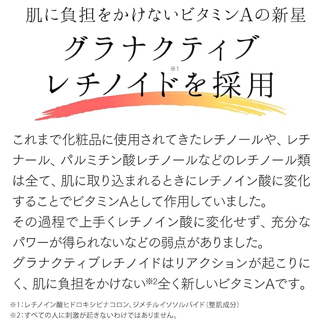 【ビタミンA上級者の方におすすめ!グラナクティブレチノイド7%を配合】なめらか乳液タイプで、肌にツヤとうるおいを与えます。※すべての人に刺激が起きないわけではありません。一時的に赤みや皮むけが起きる場合もございます。