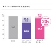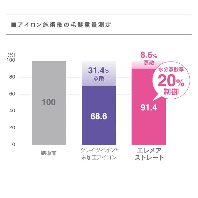 プレミアムクレイツイオンが「潤い」を閉じ込め水分の蒸散を制御。 エレメアストレートはクレイツイオン未加工アイロンに比べ、毛髪水分の蒸発を約23%制御する効果があることを実証。 アイロンの熱によるぱさつきを抑え、潤いのあり思わずうっとりするような質感に。 ※検体はダメージ毛にて計測