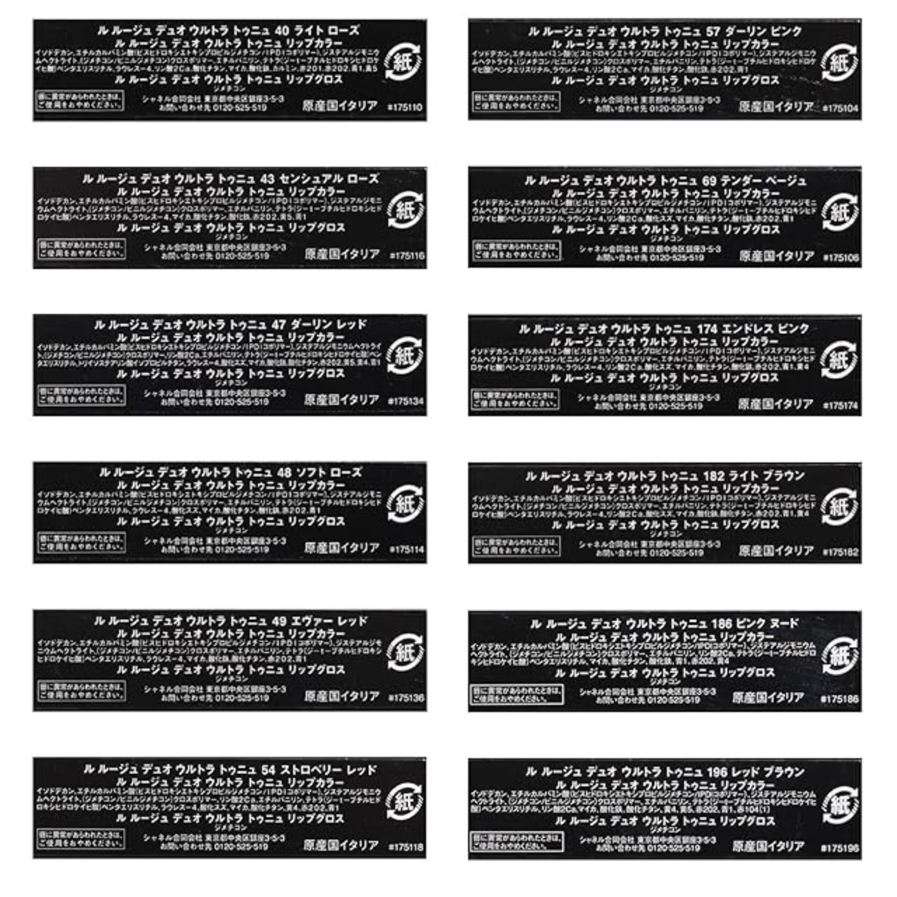 ブランド<br> CHANEL(シャネル)<br><br> 成分<br> 画像参照<br><br> 容量<br> 8ml<br><br> カラー<br> 40 ライトローズ<br> 43 センシュアルローズ<br> 47 ダーリンレッド<br> 48 ソフトローズ<br> 49 エヴァーレッド<br> 54 ストロベリーレッド<br> 57 ダーリンピンク<br> 69 テンダーベージュ<br> 174 エンドレスピンク<br> 182 ライトブラウン<br> 186 ピンクヌード<br> 196 レッドブラウン<br><br> 付属品<br> ショップバッグ<br>