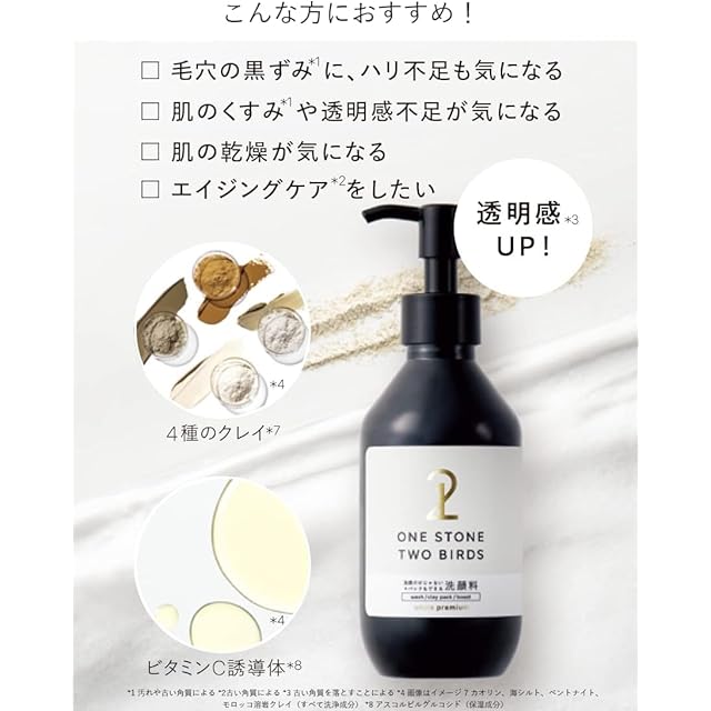 *1 カオリン(洗浄成分) *2 くすみの元となる古い角質 *3 古い角質を落とすことによる *4 カオリン、海シルト、ベントナイト、モロッコ溶岩クレイ(すべて洗浄成分) *5 アスコルビルグルコシド(保湿成分) *6 保湿成分 *7 潤いを与えキメを整えることによる *8 アルガニアスピノサ核油(保湿成分)