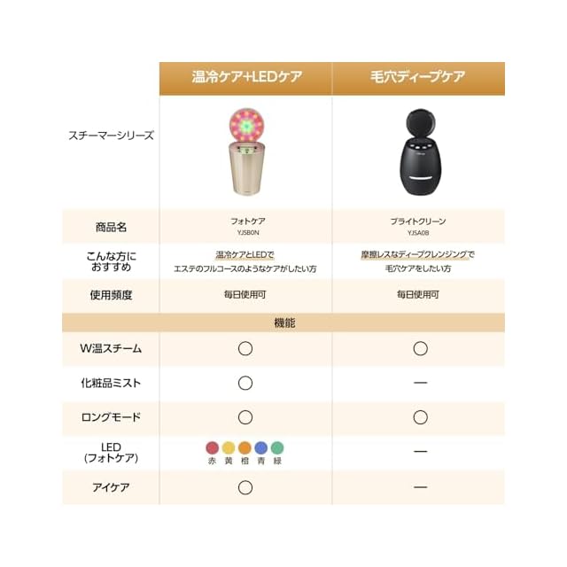 YA-MAN フォトケア / YJSB0N / サイズ:約W157 × D157 × H229 (mm) / 重量:約1.6kg (給水タンク・ミストタンク・風よけフラップ含む)、タンク容量:約170mL、ミストタンク容量:約3mL / セット内容:本体、給水タンク、ミストタンク、風よけフラップ / 定格電源:AC100V 50‐60Hz、消費電力:約550W / 製造国:中国