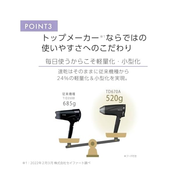 新開発の小型高効率モーター搭載で速乾力はそのままに、従来機種から24%(※7)軽量化を実現。本体サイズもひとまわりコンパクトになりました。※7:当社従来機種 TID3500比