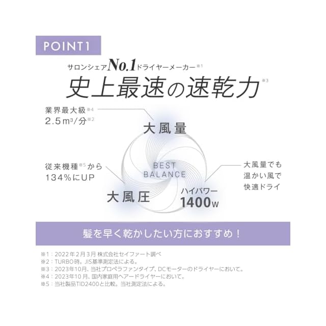 ※2:2023年10月、当社プロペラファンタイプ、DCモーターのドライヤーにおいて ※3:2023年10月、国内家庭用ヘアードライヤーにおいて ※4:TURBO使用時 ※5:TID2400との比較、当社測定法による ※6:定格容量が1400W未満のコンセントではお使いになれません