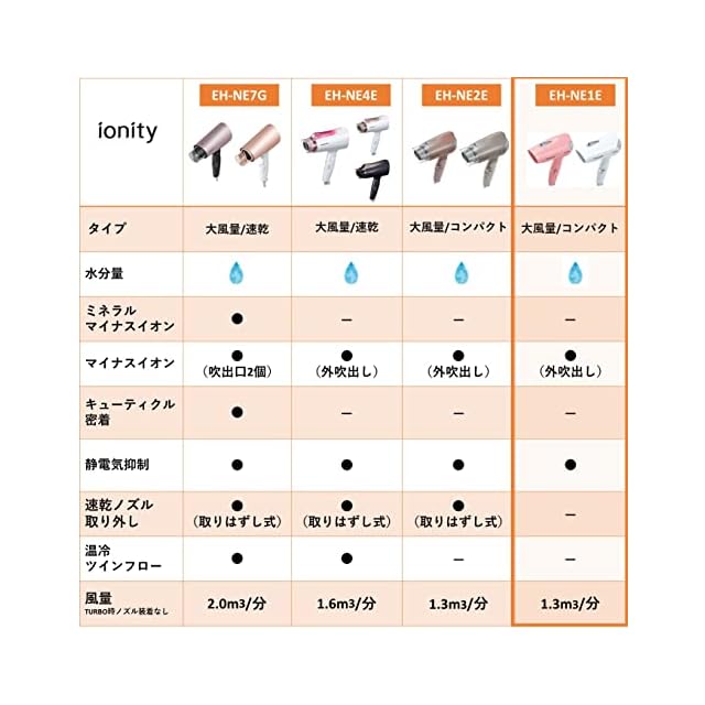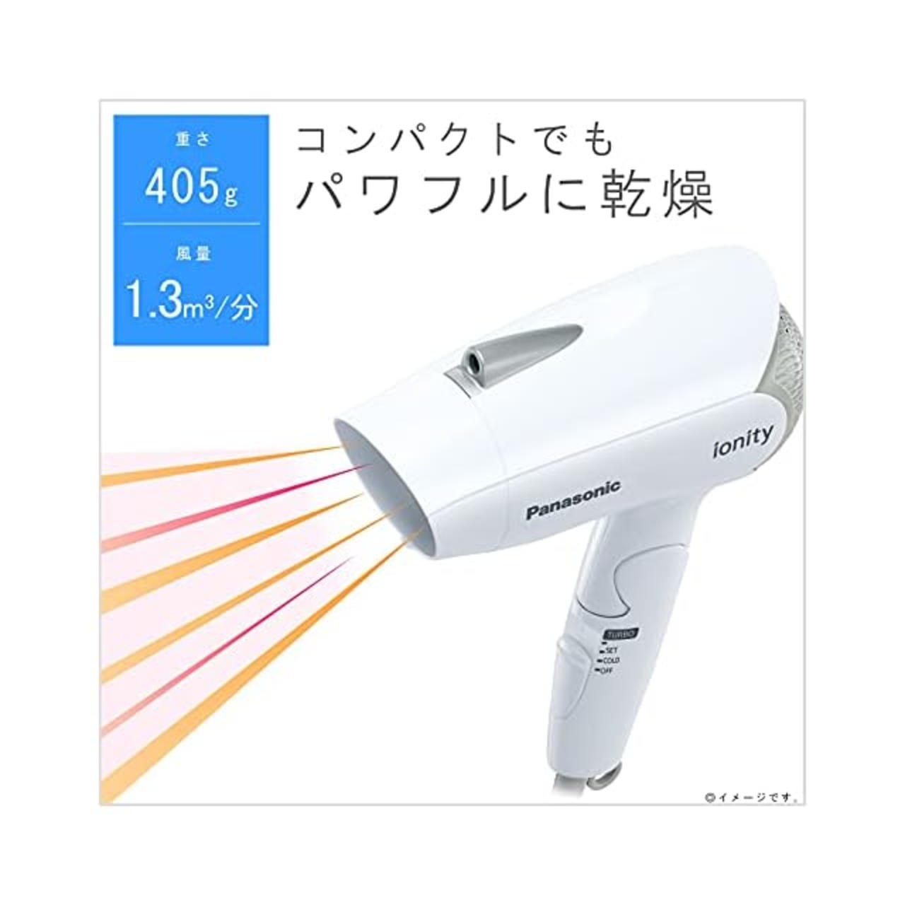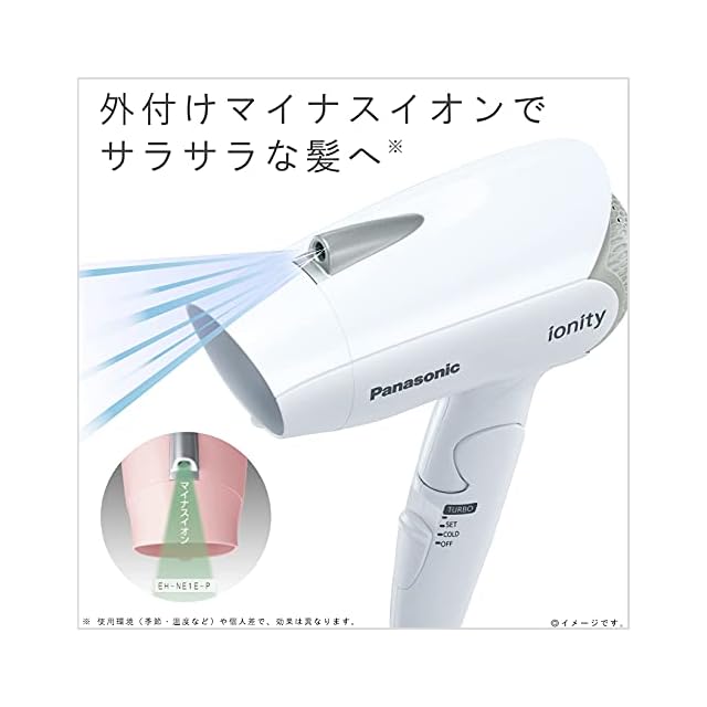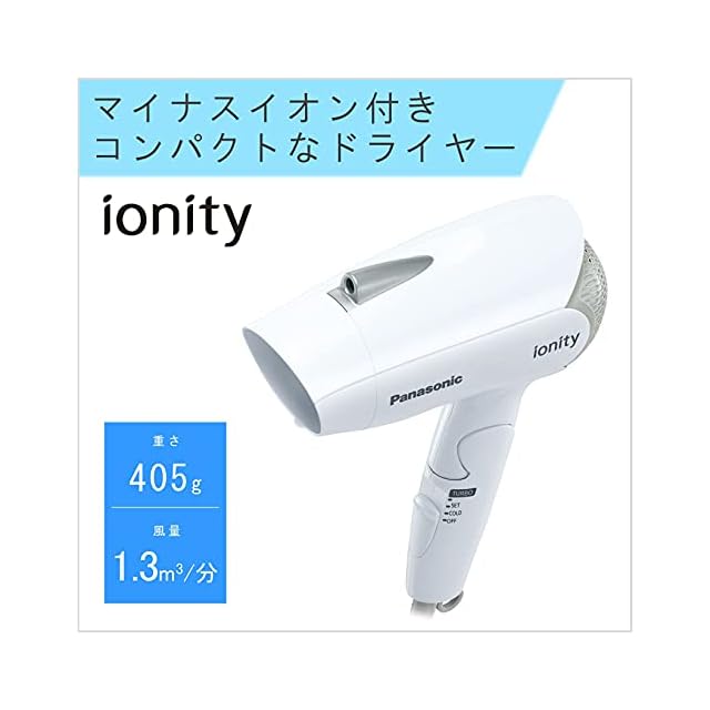 風量1.3m3/分、コンパクトタイプのヘアードライヤー「イオニティ EH-NE1E」、本体色はホワイトです。