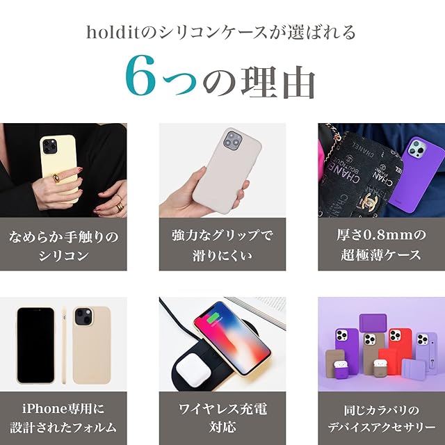ワンランク上のシリコンケース。シンプルで上品な北欧デザイン。<br>holditブランドが手掛けるシリコンケースはよりスマホに密着した機能的かつ、手元をオシャレ部。<br>同じカラバリのAirPodsケースやAppleWatchバンド、ラップトップケースなどと揃えて使用可能に。好きな色を自由に、組み合わせが無限大に広がる。<br>30色以上のカラーバリエーション。くすみカラーからビビットカラーまで、豊富なカラーバリエーション。お好きな色を楽しむことができます。<br>シリコンケースが選ばれる6つの理由は「1.なめらか手触りのシリコン」・「2.強力なグリップで滑りにくい」・「3.厚さ0.8mmの超極薄ケース」・「4.iPhone専用に設計されたフォルム」・「5.ワイヤレス充電対応」・「6.同じカラバリのデバイスアクセサリー」<br>【カラー:Moss Green モスグリーン】<br>知的で落ち着いた深い緑色。<br>カジュアルを大人っぽく引き締め、持っているだけでオシャレでスマートな印象に。