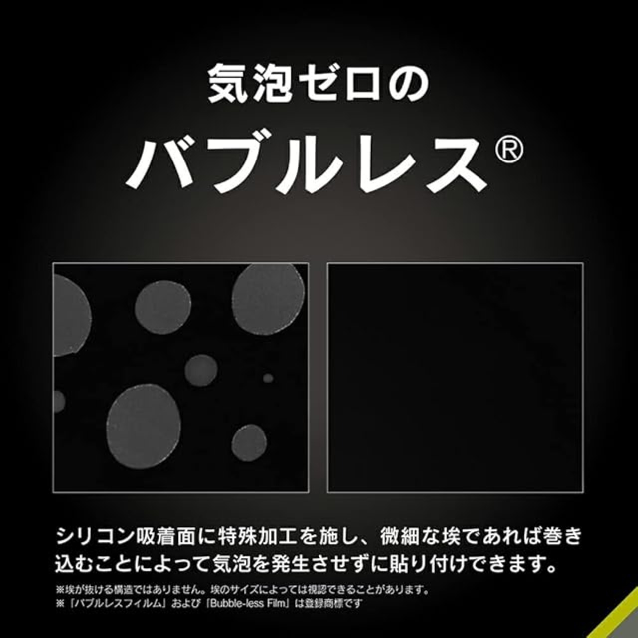気泡ゼロの「バブルレス」仕様 シリコン吸着面に特殊加工を施し、微細な埃であれば巻き込むことによって気泡を発生させずに貼り付けできます。 ※埃が抜ける構造ではありません。埃のサイズによっては視認できることがあります。 ※「バブルレスフィルム」および「Bubble-less Film」は登録商標です