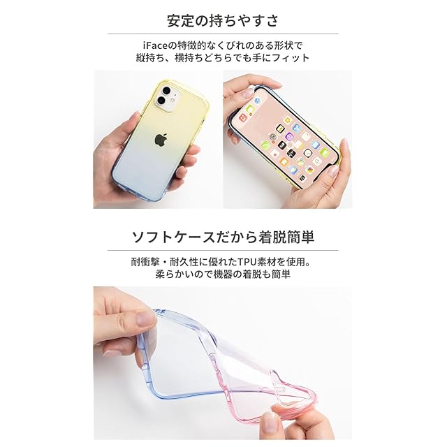 Color Me Pop!甘くておいしそうなグラデーションカラー。<br><br>キャンディみたいなポップなカラーで、グラデーションが印象的なiFace Look in Clear Lolly(ロリー)。<br><br>iPhoneの色を透かして自分なりのグラデーションカラーを楽しむのもよし、iFaceのインナーシート(1枚推奨)を挟んでアレンジしてもOK。フチの透け感が可愛いので、淡い色の機器はもちろん、濃い色の機器でも楽しめます。<br><br>・アメリカ国防総省の軍事規格「MIL-STD-810G」に準拠した耐衝撃性<br>・ドット加工で密着痕を防ぐ<br>・「くびれ」と「適度な厚み」で持ちやすい<br>・ストラップホール付き<br>・iFaceスマホリング、iFace画面保護シートとの併用も可能<br>※iFaceスマホリングと併用する際には一日ほど置くとしっかり貼り付きます。<br><br>●本製品ご使用における人体・スマートフォン本体を含む持ち物・データなどの損傷、損失、紛失に対し、弊社は一切の責任を負いかねます。<br>●スマートフォン本体に異常がある場合は本製品を外してください。<br>●画面保護フィルムの形状により本製品と併用できない場合があります。<br>●背面カメラでの撮影時に写り込みが起こる場合があります。<br>●ご使用の充電器や環境によってワイヤレス充電がご利用いただけない場合があります。<br>●ご利用状況・環境、溶剤の使用などにより変色や変質が起きることがあります。<br>●本製品装着やOSアップデートにより、スマートフォンの一部機能が使えなくなる可能性があります。<br>●本製品およびパッケージは改良のため予告なく仕様を変更する場合があります。<br>●記載されている製品名・会社名などは各社の商標または登録商標です。<br>●本製品は個別に特殊な方法で着色しているため、色の濃淡や模様には個体差があります。●製品に入っているドット加工は、スマートフォン本体との密着痕を防ぐためのものです。<br>●新型iPhone用ケースについては、実機発売後のMIL試験実施となります。<br><br>商品仕様 <br><br>ストラップ使用:可 <br>主素材:TPU <br>:有(30日間)