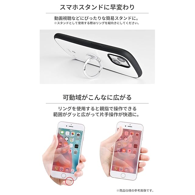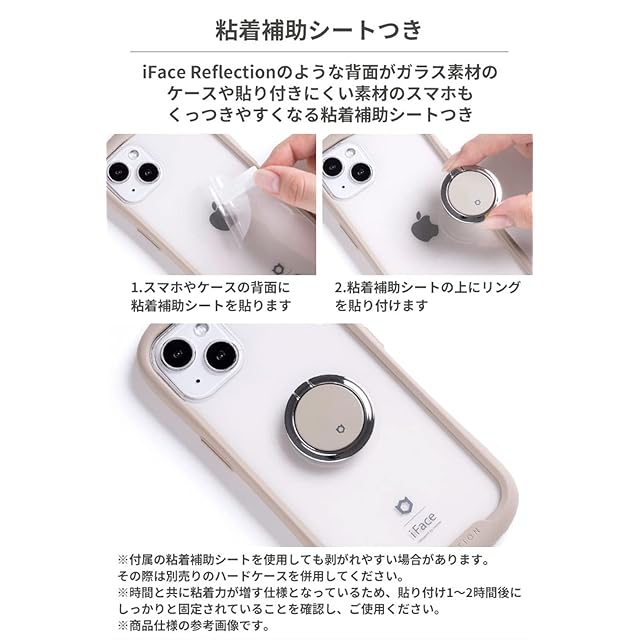 ●本製品ご使用における人体・スマートフォン本体を含む持ち物・データなどの損傷、損失、紛失に対し、弊社は一切の責任を負いかねます。●スマートフォンやケースの重量、形状、材質により貼り付け強度に差が生じます。●時間と共に粘着力が増す仕様のため、貼り付け1~2時間後にしっかりと固定されていることを確認してご使用ください。●本製品は貼り直しができません。●ガラス素材のスマートフォンやケースをご利用の際は、付属の粘着補助シートをご使用ください。●粘着補助シートは貼り直しができません。●すりガラス素材にはご使用できません。市販のポリカーボネート製ケースなどと併用してください。●落下防止のため、リング部分のみで機器を持ち上げることはおやめください。●ご利用状況・環境、溶剤の使用などにより変色や変質が起きることがあります。●小さな部品がありますので誤飲にご注意ください。●本製品およびパッケージは改良のため予告なく仕様を変更する場合があります。●記載されている製品名・会社名などは各社の商標または登録商標です。