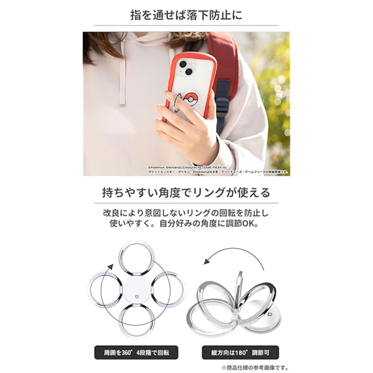 お気に入りのモンスターボールのデザインのスマホリングを見つけよう<br><br>iFace Finger Ring Holderから「ポケモン」のモンスターボールのデザインのスマホリングが登場しました。<br><br>モンスターボール、スーパーボール、ハイパーボール、マスターボール、プレミアボール、ムーンボール、ダイブボール、ゴージャスボール、ラブラブボール、クイックボールの全10種類!<br>お気に入りのモンスターボールを使ったり、好きなポケモンに合わせてケースとコーデしてみたり、色々とアレンジを楽しめちゃいます。<br>シンプルなデザインなので、ポケモンのデザインのiFaceとの組み合わせもバッチリ。<br><br><br>フラットな背面なので、ケース背面を下にして置いた時のガタつきを軽減。<br>またポケットにもスルッと入るので、ズボンやシャツのポケットに入れて持ち運ぶ方にもおすすめです。<br><br>360度くるくると回転するので、操作しやすい指の位置に合わせて使用できます。<br>スマホスタンドとして使用する時も角度調整OK。<br><br>・さらっとしたマットな質感<br>・指を通すだけで落下を防止<br>・強力な両面テープ式、貼るだけ簡単取り付け<br>・持ちやすい角度に調節OK<br><br><br>●本製品ご使用における人体・スマートフォン本体を含む持ち物・データなどの損傷、損失、紛失に対し、弊社は一切の責任を負いかねます。<br>●スマートフォンやケースの重量、形状、材質により貼り付け強度に差が生じます。<br>●時間と共に粘着力が増す仕様のため、貼り付け1~2時間後にしっかりと固定されていることを確認してご使用ください。<br>●本製品は貼り直しができません。<br>●ガラス素材のスマートフォンやケースをご利用の際は、付属の粘着補助シートをご使用ください。<br>●粘着補助シートは貼り直しができません。<br>●すりガラス素材にはご使用できません。市販のポリカーボネート製ケースなどと併用してください。<br>●落下防止のため、リング部分のみで機器を持ち上げることはおやめください。<br>●ご利用状況・環境、溶剤の使用などにより変色や変質が起きることがあります。<br>●小さな部品がありますので誤飲にご注意ください。<br>●本製品およびパッケージは改良のため予告なく仕様を変更する場合があります。<br>●記載されている製品名・会社名などは各社の商標または登録商標です。<br><br>商品仕様<br>本体:約縦6.4×横3.5×厚0.6cm<br>重量:約17g<br>主素材:ポリカーボネート、亜鉛合金、磁石<br>付属品:粘着補助シート<br>