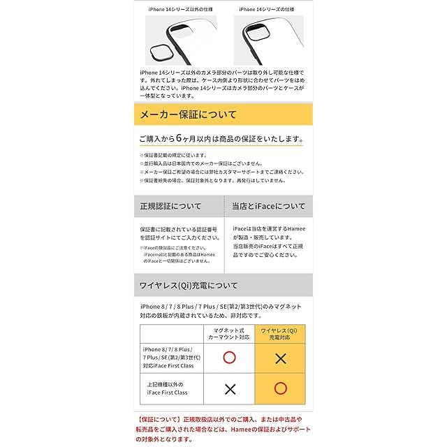 【商品仕様】 14Pro用:約縦16.3×横8.2×厚1.4cm、重量約51g / 主素材:ポリカーボネート、TPU / ワイヤレス充電:可 / ストラップ装着:可 / :有(故意または過失による破損を除く)