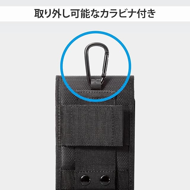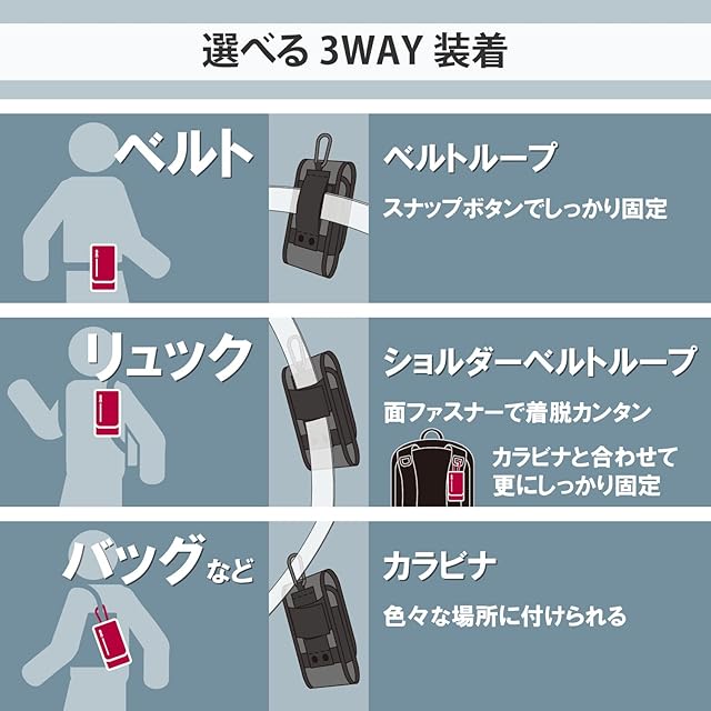 スナップボタンでしっかりとまるベルトループ、面ファスナーで固定できるショルダーベルトループ、取り外し可能なカラビナフックを装備し、お好きな装着方法を選ぶことができます。