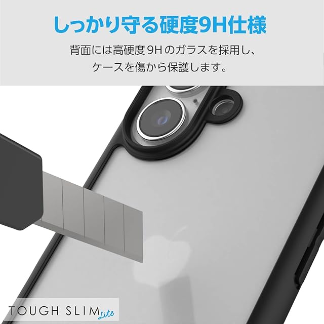 全周に配置した独自設計のエアークッションが衝撃を吸収し、背面には高硬度9Hのガラスを採用した、TOUGH SLIM LITEケースです。
