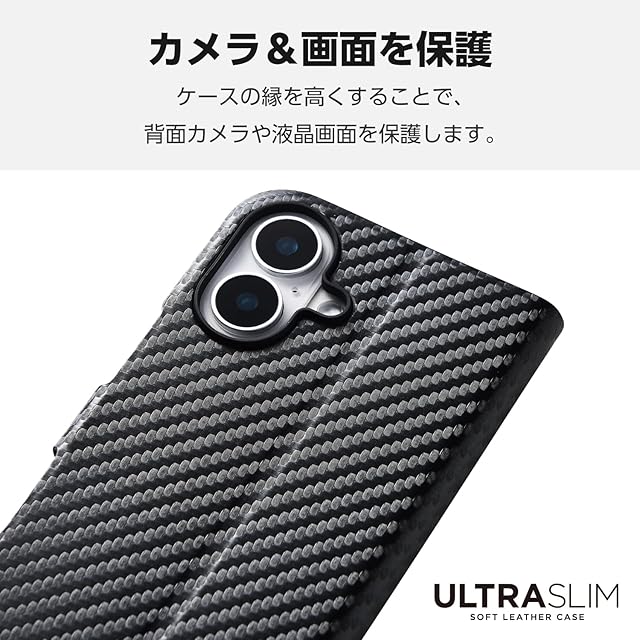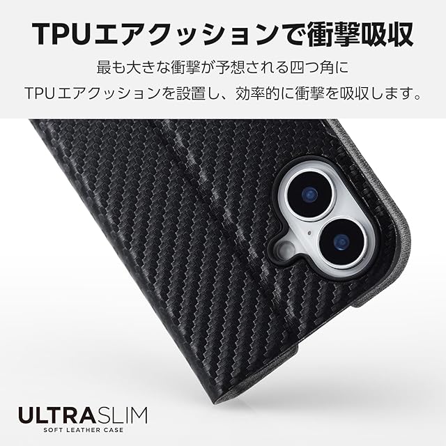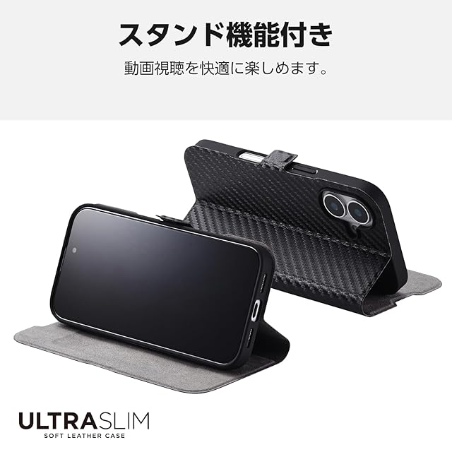 エレコム iPhone 16 ケース カバー 手帳型 薄型 軽量 ソフトレザー 磁石付き カードポケット×1 ワイヤレス充電対応 スタンド機能 4つ角エアークッション UltraSlim カーボンブラック PM-A24APLFUCB | LIS MART
