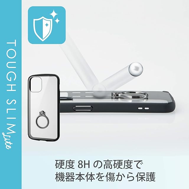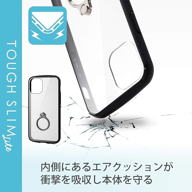 全周に配置した独自設計のエアクッションが衝撃を吸収し、背面には高硬度8Hの特殊樹脂を採用した落下防止リング付きのiPhone mini用TOUGH SLIM LITEケースです。