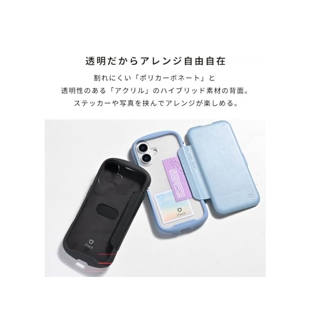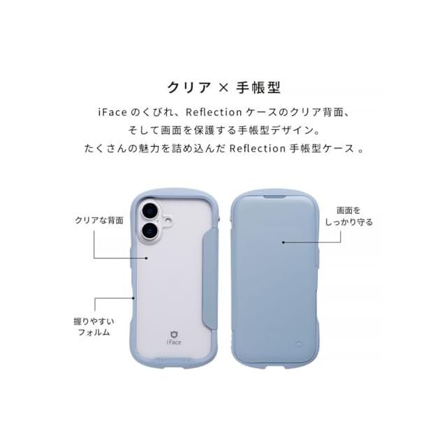 それぞれの長所をあわせ持ったクリア × 手帳型ケース<br><br>iFaceの大人気シリーズReflectionのクリア仕様を引き継いだ手帳型ケース。<br>手帳型の機能性を保ちつつ、ステッカーや写真が入れられるクリア背面で自分らしくカスタマイズが楽しめる!<br><br>・手にフィットする「くびれ」形状で持ちやすい<br>・弾力のあるTPUで、端末をしっかり保護<br>・ワントーンで揃えられたフチとフラップ<br>・クリアな背面に、シールや写真を入れてカスタマイズが可能<br>・背面はポリカーボネートとアクリルのハイブリッド素材で、割れにくい<br>・フラップにはカードポケット(1枚収納)付き<br>・Reflectionシリーズ等のiFaceアクセサリーと一緒にカラーコーデが楽しめる<br>・フラップはケース背面に折り返すことが可能<br>・選べる2カ所のストラップホール<br>・シグネチャーボール搭載でストラップの付け方が広がる<br>・iFaceストラップホルダー専用設計でショルダーストラップの使いやすさアップ<br>※ストラップホルダーを併用する場合は、iFaceから発売している製品をご使用ください。類似品ではiFaceケースと併用の使用感をしかねるため、ご注意ください。<br><br><br>●本製品ご使用における人体・デジタルデバイス本体を含む持ち物・データなどの損傷、損失、紛失に対し、弊社は一切の責任を負いかねます。<br>●本製品およびパッケージは改良のため予告なく仕様を変更する場合があります。<br>●記載されている製品名・会社名などは各社の商標または登録商標です。