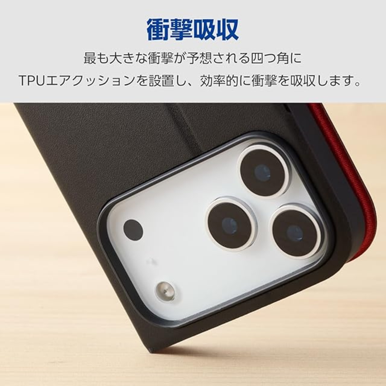 端末装着部分に衝撃を吸収するTPU(熱可塑性ポリウレタン)素材を使用し、端末を衝撃から守ります。