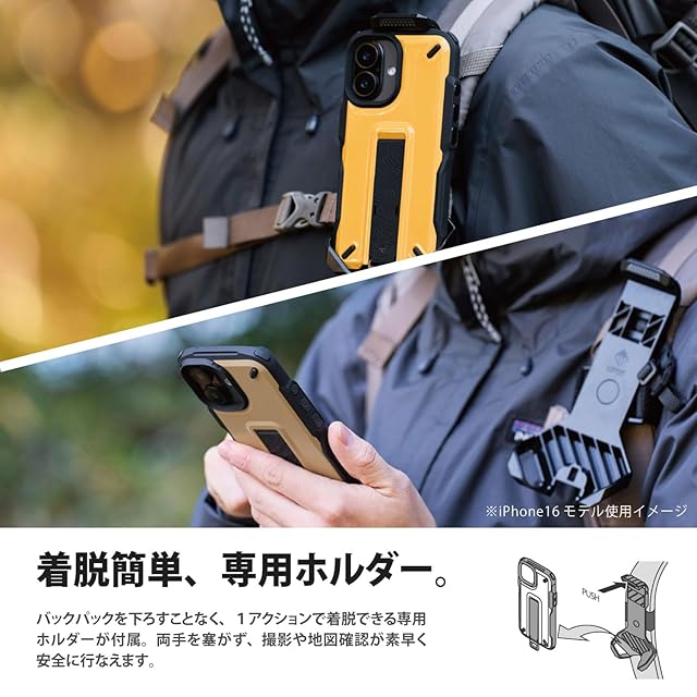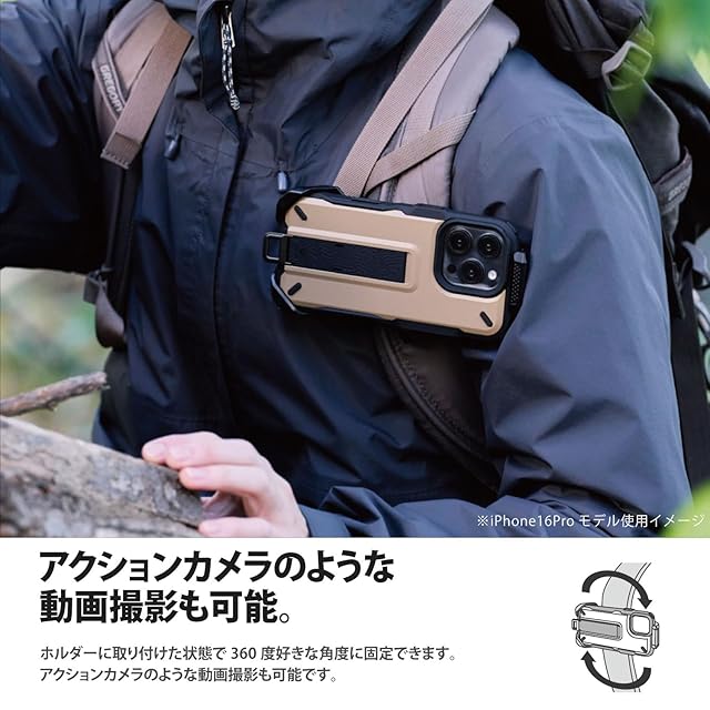 エレコム iPhone 16 Pro ケース NESTOUT 耐衝撃 衝撃吸収 [リュックのショルダーベルトに装着可能] フィンガーバンド付き スタンド機能 ストラップホール付き アウトドア サンドベージュ PM-A24CNESTBE | LIS MART