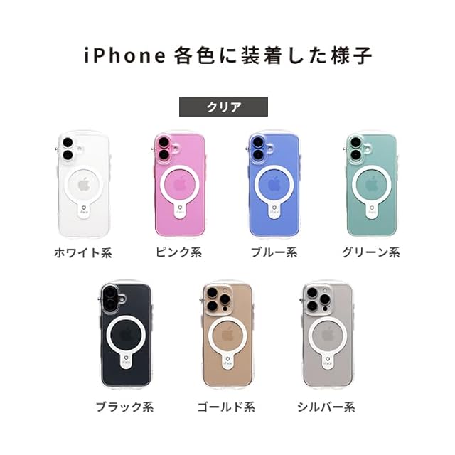 アクセサリーとも合わせやすい、MaSafe対応クリアケース。<br><br>シンプルなデザインに機能性、耐衝撃性を備えた、ミニマルなケースです。<br>MagSafeアクセサリーとの相性も良く、スタイリッシュなライフスタイルを叶えます。<br><br>・クリアな背面に、シールや写真を入れてカスタマイズが可能<br>・手にしっかりフィットする「くびれ」形状で持ちやすさ抜群<br>・側面部分は弾力のあるTPU、背面部分は硬いPC素材を採用<br>・画面とカメラを守る、フチ高設計<br>・側面のドット加工で密着痕を防止<br>・MagSafe充電/各種MagSafeアクセサリー対応<br>・選べる2カ所のストラップホール<br>・シグネチャーボール搭載でストラップの付け方が広がる<br><br><br>●本製品ご使用における人体・デジタルデバイス本体を含む持ち物・データなどの損傷、損失、紛失に対し、弊社は一切の責任を負いかねます。<br>●デジタルデバイス本体やケースに発熱などの異常がある場合は本製品を外してください。<br>●ケースとデジタルデバイスの間に金属フィルムや金属片を挟むとワイヤレス充電時に異常発熱や機器故障の原因となることがあります。ケースのカスタマイズ時には十分ご注意ください。<br>●本製品およびパッケージは改良のため予告なく仕様を変更する場合があります。<br>●記載されている製品名・会社名などは各社の商標または登録商標です。<br>●画面保護フィルムの形状により本製品と併用できない場合があります。<br>●背面カメラでの撮影時に写り込みが起こる場合があります。<br>●本製品内蔵のマグネットにより、デジタルデバイスのコンパスアプリやカメラ動作等に影響する場合があります。<br>●ご使用の充電器や環境によってワイヤレス充電がご利用いただけない場合があります。<br>●ご利用状況・環境、溶剤の使用などにより変色や変質が起きることがあります。<br>●本製品装着やOSアップデートにより、デジタルデバイスの一部機能が使えなくなる可能性があります。<br>●小さな部品がありますので誤飲にご注意ください。<br><br><兼用ケースの場合><br>●複数の機種に装着可能なケースのため、ご使用の機種によっては一部のボタンやカメラ周りの隙間などが均等でなく片寄ることがあります。<br><br>商品仕様<br>15/14/13用:約縦15.8×横7.9×厚1.3cm、重量約34g<br>主素材:ポリカーボネート、TPU、マグネット<br>ストラップ使用:可<br>ワイヤレス充電:可<br>:有