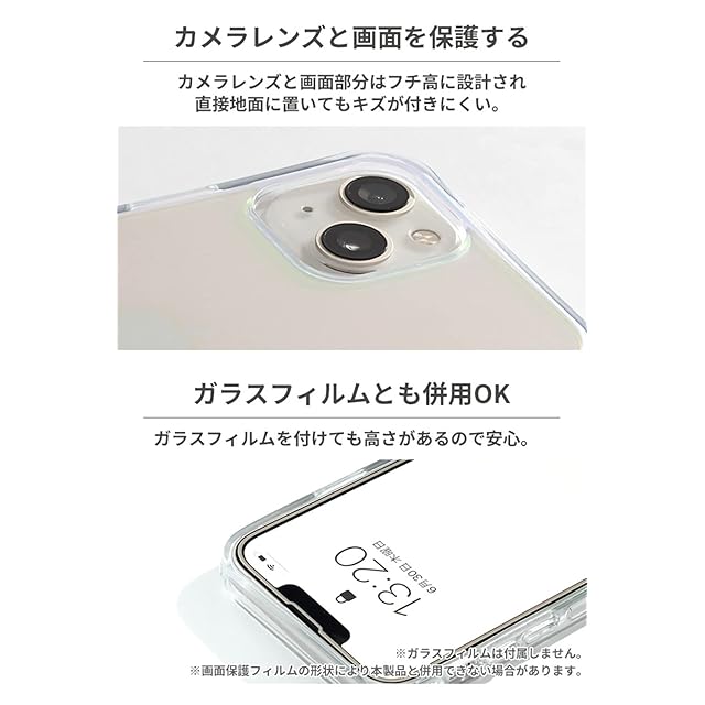 ●側面にプリズム加工は施されていません。●本製品ご使用における人体・スマートフォン本体を含む持ち物・データなどの損傷、損失、紛失に対し、弊社は一切の責任を負いかねます。●スマートフォン本体やケースに発熱などの異常がある場合は本製品を外してください。●画面保護フィルムの形状により本製品と併用できない場合があります。●背面カメラでの撮影時に写り込みが起こる場合があります。●ご使用の充電器や環境によってワイヤレス充電がご利用いただけない場合があります。●ご利用状況・環境、溶剤の使用などにより変色や変質が起きることがあります。●本製品装着やOSアップデートにより、スマートフォンの一部機能が使えなくなる可能性があります。●本製品およびパッケージは改良のため予告なく仕様を変更する場合があります。●記載されている製品名・会社名などは各社の商標または登録商標です。