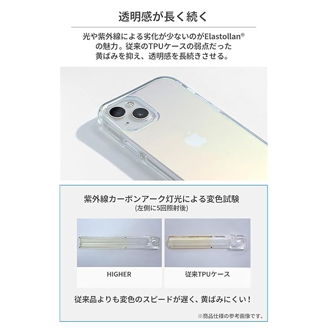 こだわりのクリアケースにオーロラの輝きをプラス!<br><br>機能性にこだわり抜いたブランド「HIGHER(ハイアー)」から、色の変化が楽しいオーロラカラーのクリアケースが登場。<br>HIGHERのケースは「耐衝撃性・耐候性・抗菌性」すべてを備えた高機能ケース。シンプルなデザインの中に、妥協のないこだわりが詰め込まれています。<br><br>・背面にプリズム加工を施し、光の当たり方によって色合いが変化<br>・機種の色によってガラッと違う印象に<br>・BASF社製の高機能素材、Elastollan(R)採用<br>・2つの落下試験にクリアした優れた耐衝撃性<br>・豊富なエアポケットで衝撃を吸収<br>・黄ばみに強く、透明感が長く続く<br>・JIS Z2801に基づいた抗菌性<br>・持ちやすいやや丸みを帯びた形<br>・カメラや画面に傷が付きにくいフチ高設計<br>・ストラップ装着可能<br><br>●側面にプリズム加工は施されていません。<br>●本製品ご使用における人体・スマートフォン本体を含む持ち物・データなどの損傷、損失、紛失に対し、弊社は一切の責任を負いかねます。<br>●スマートフォン本体やケースに発熱などの異常がある場合は本製品を外してください。<br>●画面保護フィルムの形状により本製品と併用できない場合があります。<br>●背面カメラでの撮影時に写り込みが起こる場合があります。<br>●ご使用の充電器や環境によってワイヤレス充電がご利用いただけない場合があります。<br>●ご利用状況・環境、溶剤の使用などにより変色や変質が起きることがあります。<br>●本製品装着やOSアップデートにより、スマートフォンの一部機能が使えなくなる可能性があります。<br>●本製品およびパッケージは改良のため予告なく仕様を変更する場合があります。<br>●記載されている製品名・会社名などは各社の商標または登録商標です。<br>●新型iPhone用ケースについては、実機発売後のMIL試験実施となります。<br><br><br>商品仕様<br>主素材:TPU(エラストラン)、PET<br>ストラップ装着:可<br>ワイヤレス充電:可