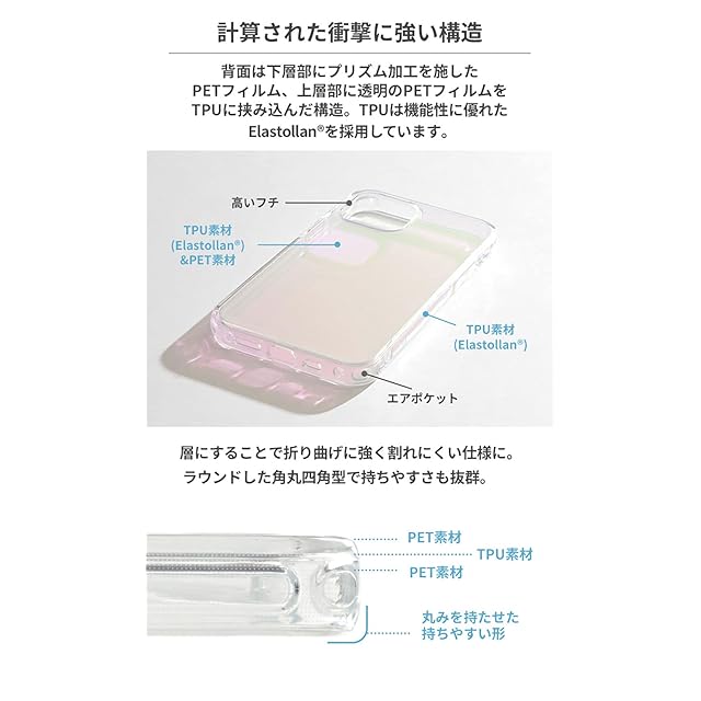BASF社製の高機能素材、Elastollan(R)採用。黄ばみに強く、透明感が長く続く。カメラや画面に傷が付きにくいフチ高設計。2つの落下試験にクリアした優れた耐衝撃性。豊富なエアポケットで衝撃を吸収。JIS Z2801に基づいた抗菌性。ストラップ装着可能。