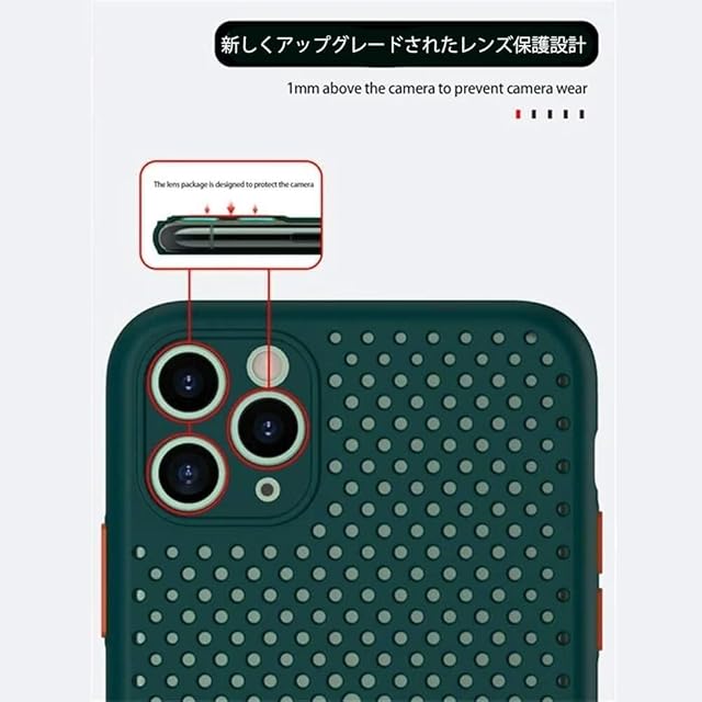●メッシュデザイン & 放熱メッシュ構造:ケースの冷却効果により、iPhoneの発熱を抑えることができます。この効果は、メッシュ構造によりエアフローを促進しiPhoneから出る熱の拡散を促進します、放熱を促すことによって得られ、iPhoneの動作パフォーマンスにも良い影響を与えます。