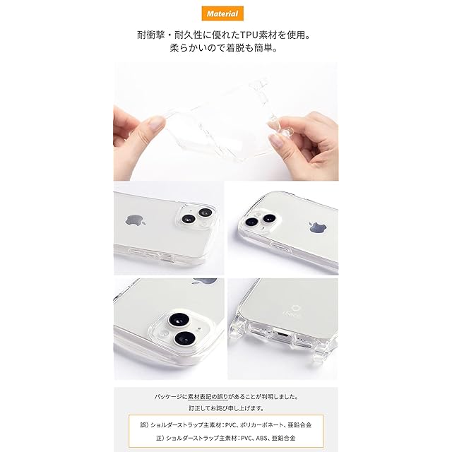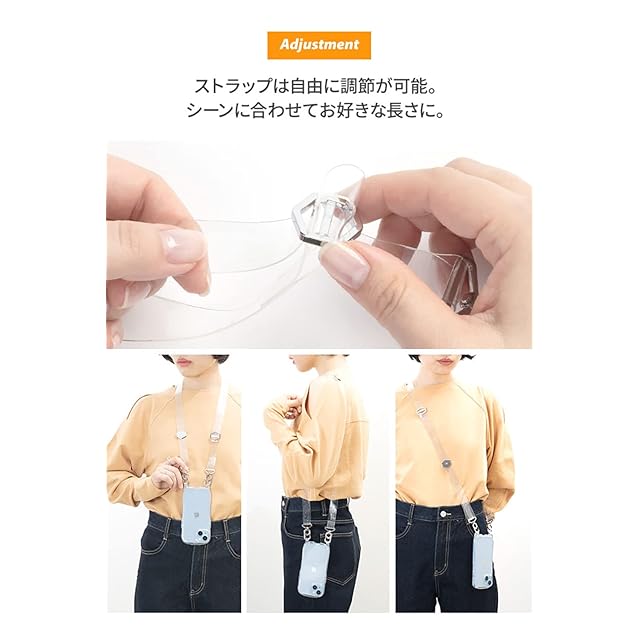 ●低温時は硬くなる素材のため、ストラップの癖が取れない場合は暖かい部屋などで柔らかくしてからご使用ください。●ストラップが電車、エレベータ、自動ドアなどに挟まれたり引っかかると大変危険です。十分ご注意ください。●摩擦等により紐が劣化した場合は速やかに使用を中止してください。落下・破損等の原因となります。●ご利用状況・環境、溶剤の使用などにより変色や変質が起きることがあります。●本製品装着やOSアップデートにより、スマートフォンの一部機能が使えなくなる可能性があります。●本製品およびパッケージは改良のため予告なく仕様を変更する場合があります。●記載されている製品名・会社名などは各社の商標または登録商標です。●ストラップは衣類の上からのご使用をおすすめします。●こちらは透ける仕様の商品です。