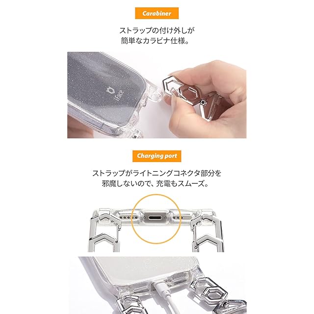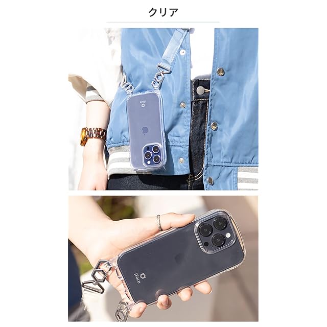 iFaceショルダーストラップつきケースHang andからクリアタイプが登場。ショルダーストラップ付きスマホケース「iFace Hang and (ハングアンド)」。スマホを肩からかけることで、落す心配やケースをカバンやズボンのポケットから出し入れするプチストレスを解消します。透明なのでiPhoneの本体の色を楽しむのも、iFaceインナーシートやシールなどを挟んでアレンジを楽しむのもおすすめ。※iFaceインナーシート1枚まで推奨・ケースとストラップのセット・ケース内側には密着痕を防ぐドット加工・長さ調整が可能な平紐のストラップ・ショルダーストラップが着脱しやすいオリジナルデザインのカラビナ・スマホケースを付けたまま充電が可能