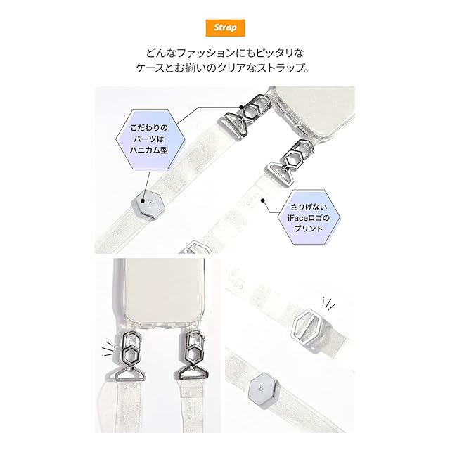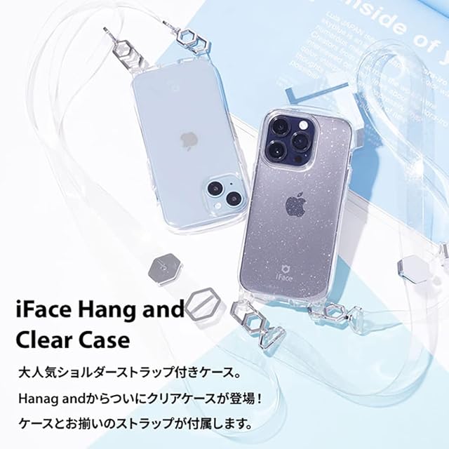 iFaceショルダーストラップつきケースHang andからクリアタイプが登場<br><br>ショルダーストラップ付きスマホケース「iFace Hang and (ハングアンド)」。<br>スマホを肩からかけることで、落す心配やケースをカバンやズボンのポケットから出し入れするプチストレスを解消します。<br><br>ソフトな素材のiPhoneケース&クリアショルダーストラップのセットです。<br>ショルダーストラップは使いやすい長さ調整が可能。<br>両端はiFaceオリジナルのハニカム型のカラビナで、ストラップを外したいときに簡単に取り外すことができ便利です。<br>珍しいクリアのショルダーストラップは、ファッションのアクセントにも。<br><br>透明なのでiPhoneの本体の色を楽しむのも、iFaceインナーシートやシールなどを挟んでアレンジを楽しむのもおすすめ。<br><br>・ケースとストラップのセット<br>・ケース内側には密着痕を防ぐドット加工<br>・長さ調整が可能な平紐のストラップ<br>・ショルダーストラップが着脱しやすいオリジナルデザインのカラビナ<br>・スマホケースを付けたまま充電が可能<br><br>※iFaceインナーシート1枚まで推奨<br><br><br>●本製品ご使用における人体・スマートフォン本体を含む持ち物・データなどの損傷、損失、紛失に対し、弊社は一切の責任を負いかねます。<br>●スマートフォン本体やケースに発熱などの異常がある場合は本製品を外してください。<br>●画面保護フィルムの形状により本製品と併用できない場合があります。<br>●背面カメラでの撮影時に写り込みが起こる場合があります。<br>●ご使用の充電器や環境によってワイヤレス充電がご利用いただけない場合があります。<br>●製品に入っているドット加工は、スマートフォン本体との密着痕を防ぐためのものです。<br>●他のプラスチック製品と密着させると貼り付きが起こることがあります。<br>●低温時は硬くなる素材のため、ストラップの癖が取れない場合は暖かい部屋などで柔らかくしてからご使用ください。<br>●ストラップが電車、エレベータ、自動ドアなどに挟まれたり引っかかると大変危険です。十分ご注意ください。<br>●摩擦等により紐が劣化した場合は速やかに使用を中止してください。落下・破損等の原因となります。<br>●ご利用状況・環境、溶剤の使用などにより変色や変質が起きることがあります。<br>●本製品装着やOSアップデートにより、スマートフォンの一部機能が使えなくなる可能性があります。<br>●本製品およびパッケージは改良のため予告なく仕様を変更する場合があります。<br>●記載されている製品名・会社名などは各社の商標または登録商標です。<br>●ストラップは衣類の上からのご使用をおすすめします。<br>●こちらは透ける仕様の商品です。<br><br><br>商品仕様<br>8/7/SE(第2/第3世代)用:約縦15.8×横7.6×厚1.0cm、重量約34g<br>ショルダーストラップ長さ:全長(カラビナ含む)約84~146cm(調整可)<br>平紐幅:約2.1cm<br>ケース主素材:TPU<br>ショルダーストラップ主素材:PVC、ABS、亜鉛合金<br>ワイヤレス充電:可<br>:有(ケースのみ対象。ショルダーストラップは対象外。)<br><br>
