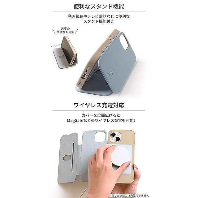 ●複数の機種に装着可能な兼用ケースは、ご使用の機種によっては一部のボタンやカメラ周りの隙間などが均等でなく片寄ることがあります。●本製品ご使用における人体・スマートフォン本体を含む持ち物・データなどの損傷、損失、紛失に対し、弊社は一切の責任を負いかねます。●スマートフォン本体やケースに発熱などの異常がある場合は本製品を外してください。●画面保護フィルムの形状により本製品と併用できない場合があります。●背面カメラでの撮影時に写り込みが起こる場合があります。●本製品内蔵のマグネットにより、スマートフォンのコンパスアプリやカメラ動作等に影響する場合があります。●本製品はマグネットを使用しております。カードポケットへの磁気カード(クレジットカード等)の収納は避けてください。読み取りができなくなるおそれがあります。●電子マネーアプリにカード情報が登録された状態では、本製品カードポケットに入れたICカード(Suica等)は読み込みができない場合があります。その場合は、電子マネーアプリのカード登録を削除してご利用ください。●本製品はカバーを閉じたままでのワイヤレス充電には対応しておりません。