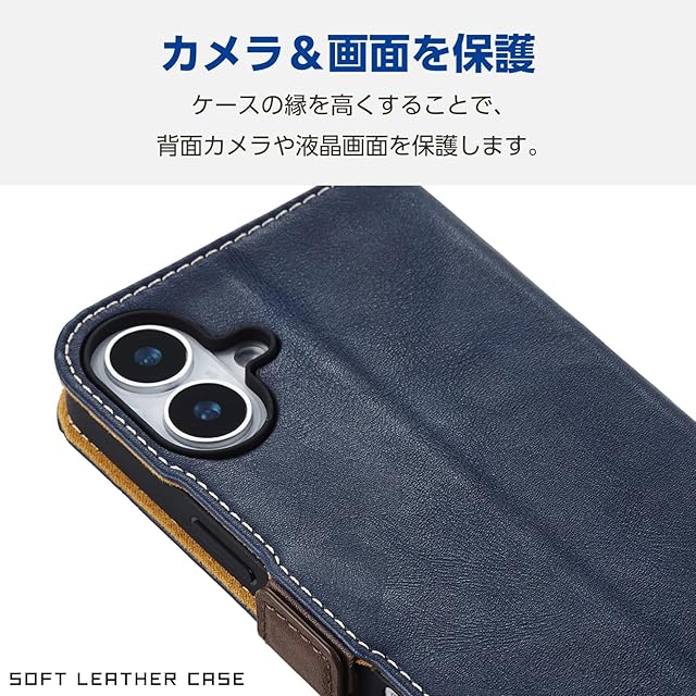 エレコム iPhone 16 Plus ケース カバー 手帳型 耐衝撃 ソフトレザー 磁石付き カードポケット×2 ワイヤレス充電対応 スタンド機能 ストラップホール付き 4つ角エアークッション ネイビー PM-A24BPLFYNV | LIS MART