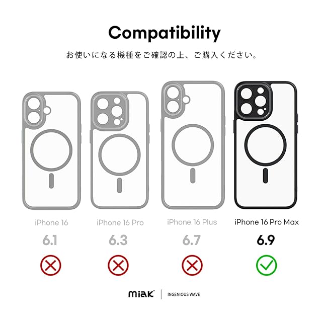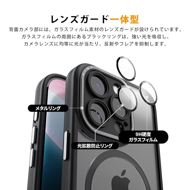 商品名:miak iPhone 16 pro Max ケース レンズガード 一体型 MagSafe対応 クリアケース [ カメラレンズ保護 アルミ合金カメラフレーム・ボタン 衝撃吸収 エアークッション 耐衝撃 防塵 背面ポリカーボネート TPUベゼル ] アイフォン 保護カバー MA27195i16PM ブラック 【国内正規品】