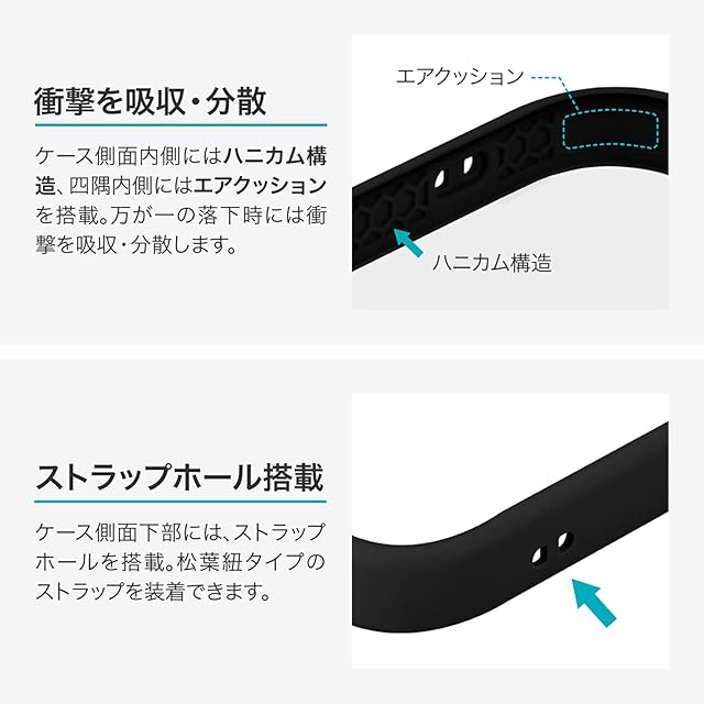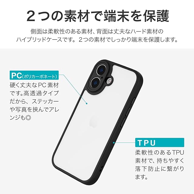 【耐衝撃】 衝撃を吸収するTPUと、硬く高透明なポリカーボネートのハイブリッドケース