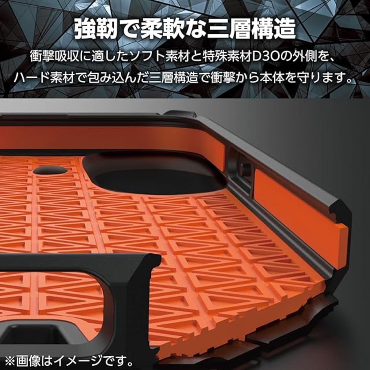 端末背面、側面が接するケース内側に特殊素材のD3O(R)を装備し、更に衝撃吸収効率の高いトラス構造を採用しています。