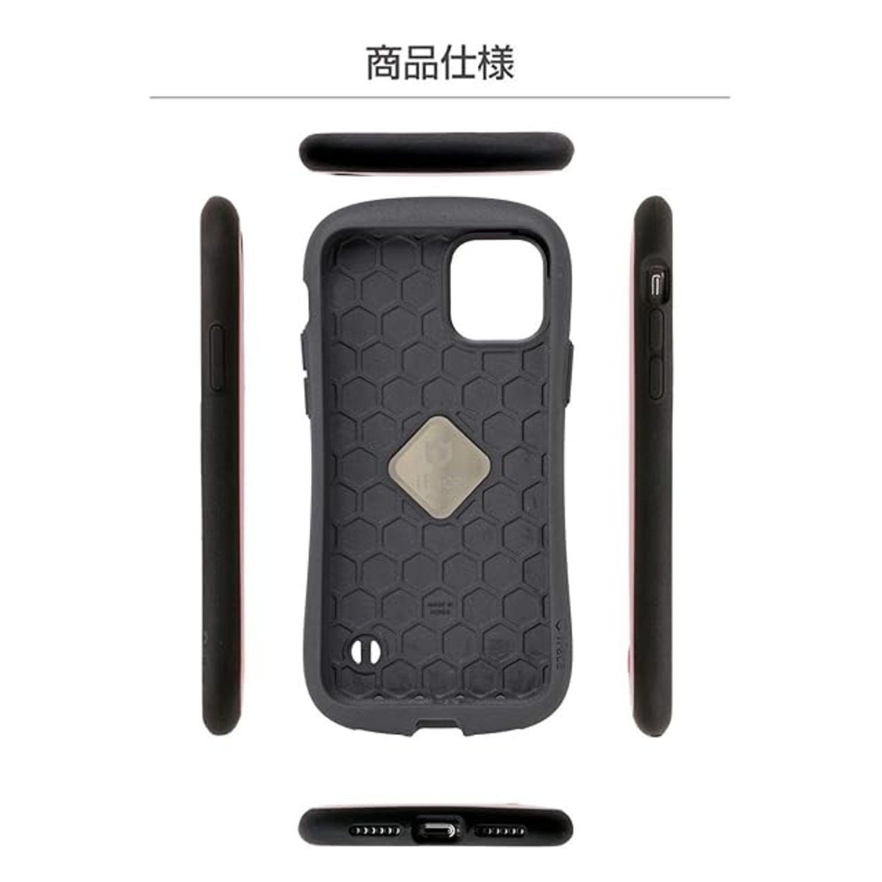 商品仕様:本体サイズ:約縦17.7×横8.8×厚1.3cm、重量約58g / 主素材:ポリカーボネート、TPU / ワイヤレス充電:可 / ストラップ装着:可 / :有