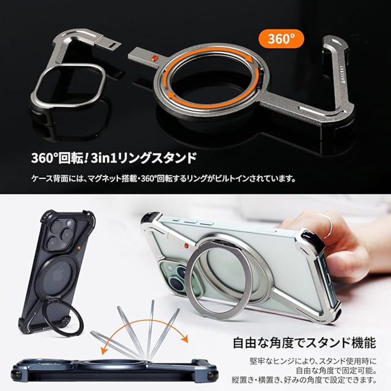 【360°回転する3in1リングスタンド】 360°回転するマグネット搭載のリングがビルトインされています。