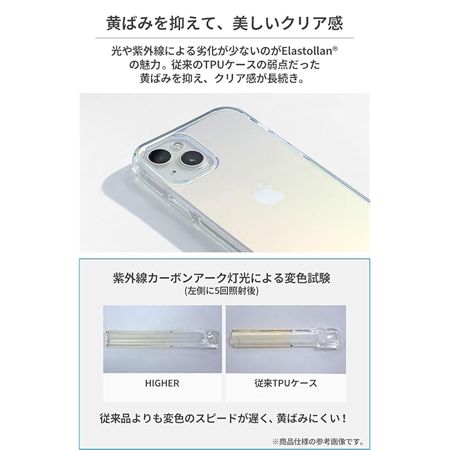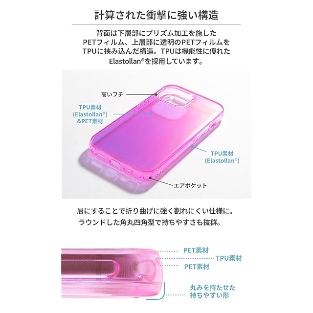 こだわりのクリアケースにオーロラ&POPなカラーをプラス!<br><br>ワンランク上の高品質透明・クリアケース『HIGHER(ハイアー)』から2023年秋発売のiPhone15シリーズに対応した高機能スマホケースが登場。<br>「耐衝撃性・耐候性・抗菌性」のすべてを備え、妥協のないこだわりが詰め込まれています。<br>また本体全体を着色し、背面はオーロラにすることで、POPなデザインとなっています。<br><br>・BASF社製の高機能素材、Elastollan(R)採用<br>・2つの落下試験にクリアした優れた耐衝撃性<br>・豊富なエアポケットで衝撃を吸収<br>・黄ばみに強く、透明感が長く続く<br>・JIS Z2801に基づいた抗菌性<br>・持ちやすいやや丸みを帯びた形<br>・カメラや画面に傷が付きにくいフチ高設計<br>・ストラップ装着可能<br><br><br>●こちらは透ける仕様のケースです。<br>●側面にプリズム加工は施されていません。<br>●本製品ご使用における人体・スマートフォン本体を含む持ち物・データなどの損傷、損失、紛失に対し、弊社は一切の責任を負いかねます。<br>●スマートフォン本体やケースに発熱などの異常がある場合は本製品を外してください。<br>●画面保護フィルムの形状により本製品と併用できない場合があります。<br>●背面カメラでの撮影時に写り込みが起こる場合があります。<br>●ご使用の充電器や環境によってワイヤレス充電がご利用いただけない場合があります。<br>●ご利用状況・環境、溶剤の使用などにより変色や変質が起きることがあります。<br>●本製品装着やOSアップデートにより、スマートフォンの一部機能が使えなくなる可能性があります。<br>●本製品およびパッケージは改良のため予告なく仕様を変更する場合があります。<br>●記載されている製品名・会社名などは各社の商標または登録商標です。<br><br><br>商品仕様<br>主素材:TPU(エラストラン)、PET<br>ストラップ装着:可<br>ワイヤレス充電:可<br>