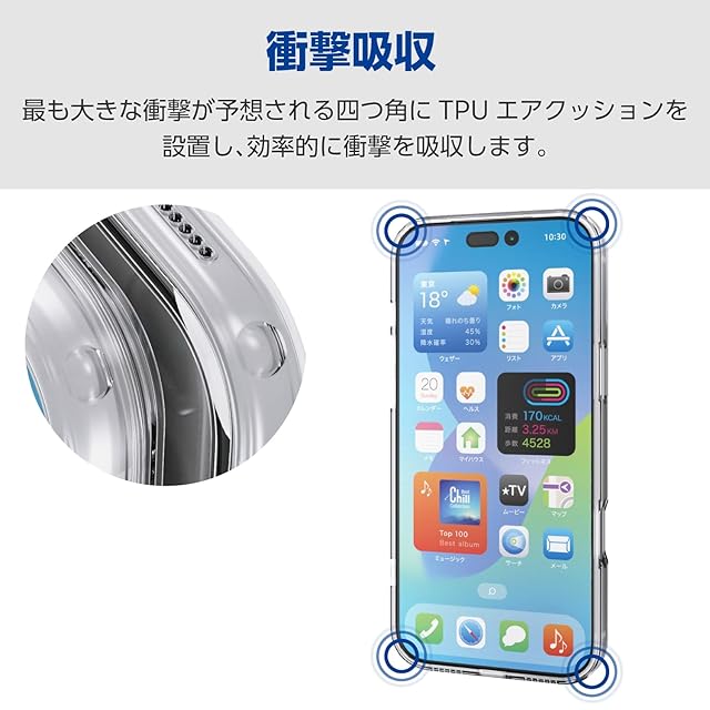 カメラ・スピーカー周りを究極までカバーする極限保護設計。側面には弾力性のあるTPU(熱可塑性ポリウレタン)素材を、背面には強じんで透明度の高いポリカーボネート素材を使用した、スリムなスタイルのハイブリッドケースです。