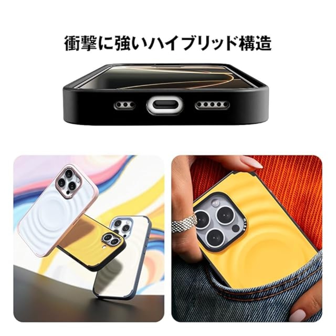 ポリカーボネート背面とTPUベゼルのハイブリッド素材で、高耐久、着脱もスムーズ。