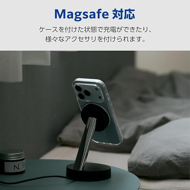 磁力装着タイプのワイヤレス充電器に対応した“MAGKEEP"シリーズ。側面には弾力性のあるTPU(熱可塑性ポリウレタン)素材を、背面には強じんで透明度の高いポリカーボネート素材にスタンドを装着させた、ハイブリッドケースです。