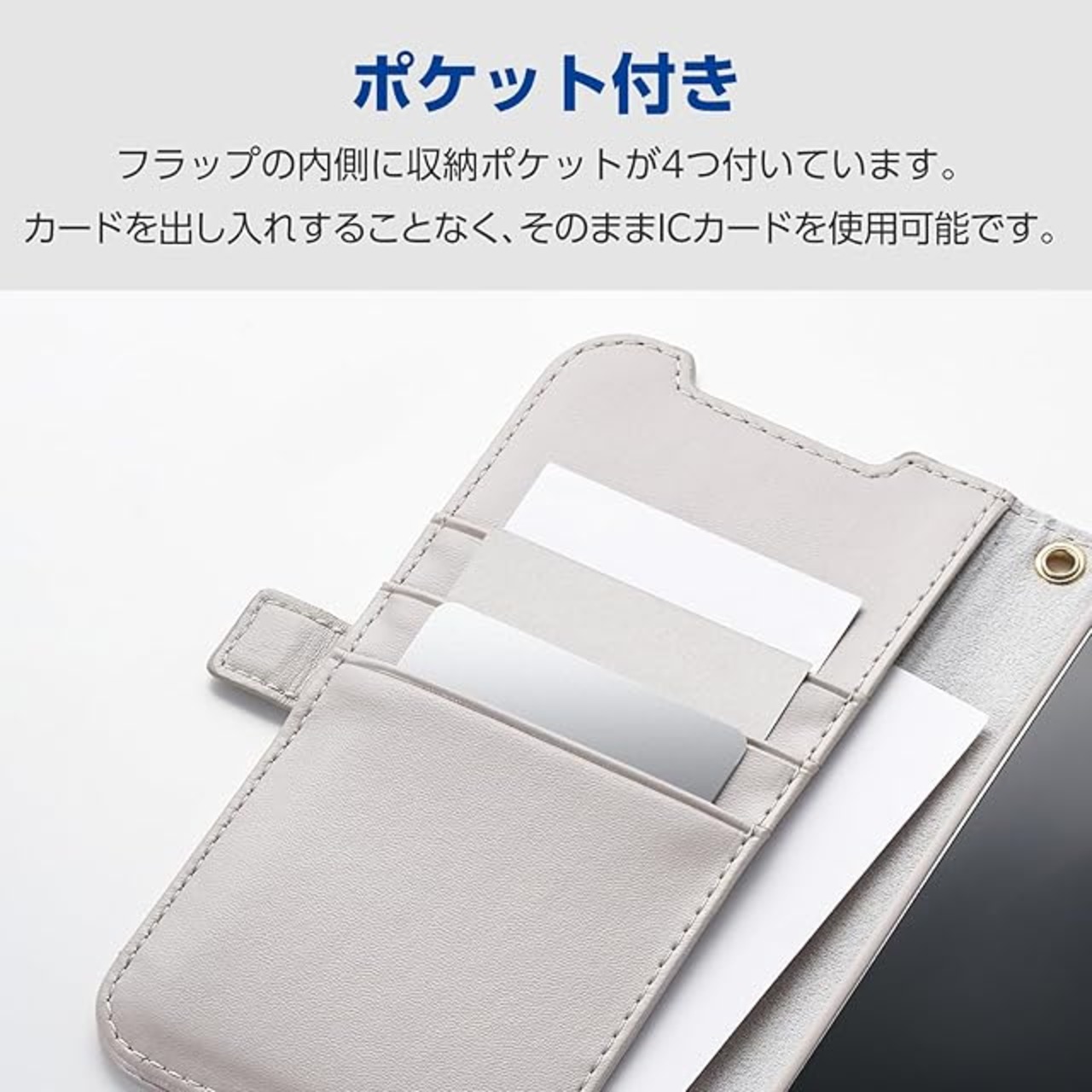 フラップの内側に、メモやカードなどが収納できるポケットが4つ付いています。カードを出し入れすることなく、そのままICカードを使用可能です。