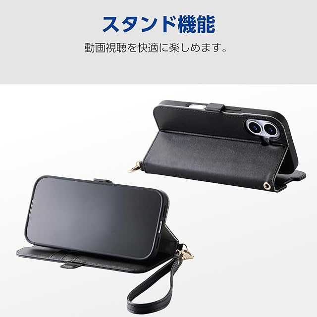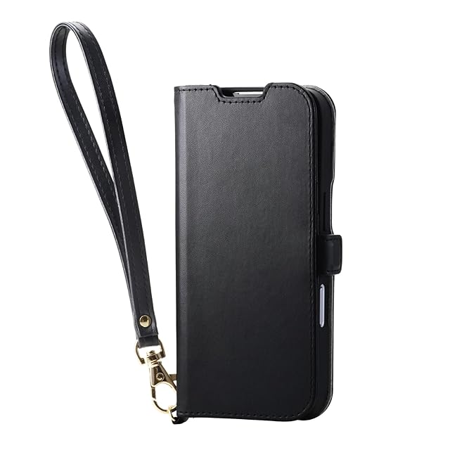 エレコム iPhone 17 ケース カバー 手帳型 ソフトレザー TPU 耐衝撃 衝撃吸収 カード収納 4つのポケット スタンド機能 ハンドストラップ付き 4つ角エアークッション ブラック PM-A25APLFY4BK | LIS MART