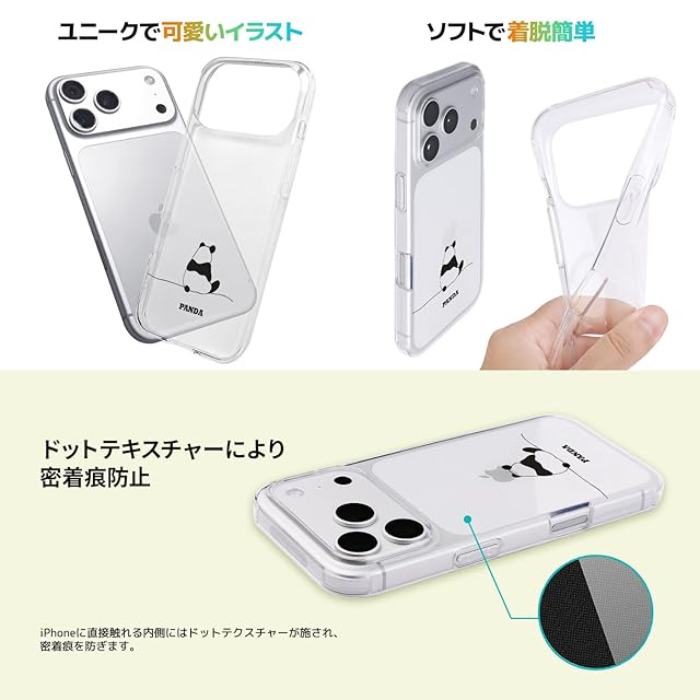 商品名:AKAN iPhone 17 用 ソフトクリアケース [ 透明 密着痕防止 TPU 変色しにくいUVプリント 防塵 ワイヤレス充電対応 ] ゆるかわ 癒し系 キャラクター パンダ AK27736i17 【国内正規品】