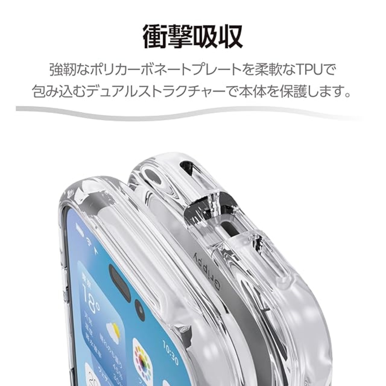 全周に配置した独自設計のエアークッションが衝撃を吸収し、背面には高硬度のポリカーボネート素材を採用。中央のくびれ形状に平坦な面を設けることで、手に馴染む快適なグリップ感を実現したGrippyシリーズのハイブリッドケースです。端末のデザインが美しく際立つオールクリアタイプです。