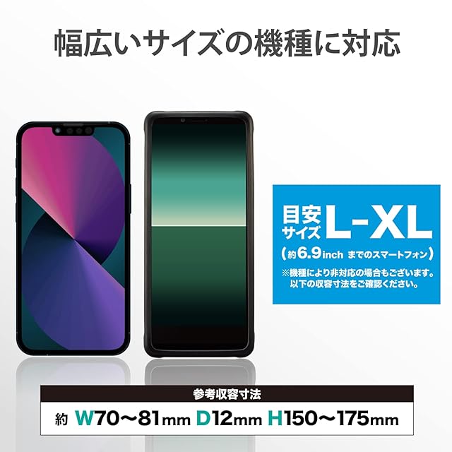 6.9インチまでのスマートフォンに装着可能なL~XLサイズです。