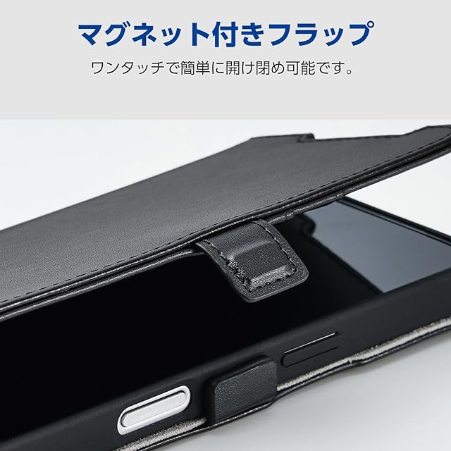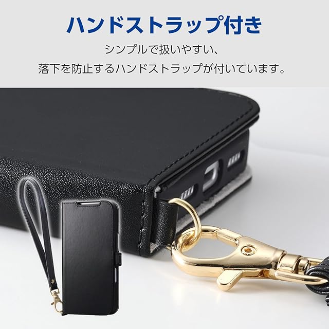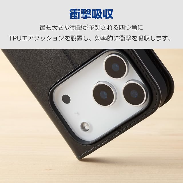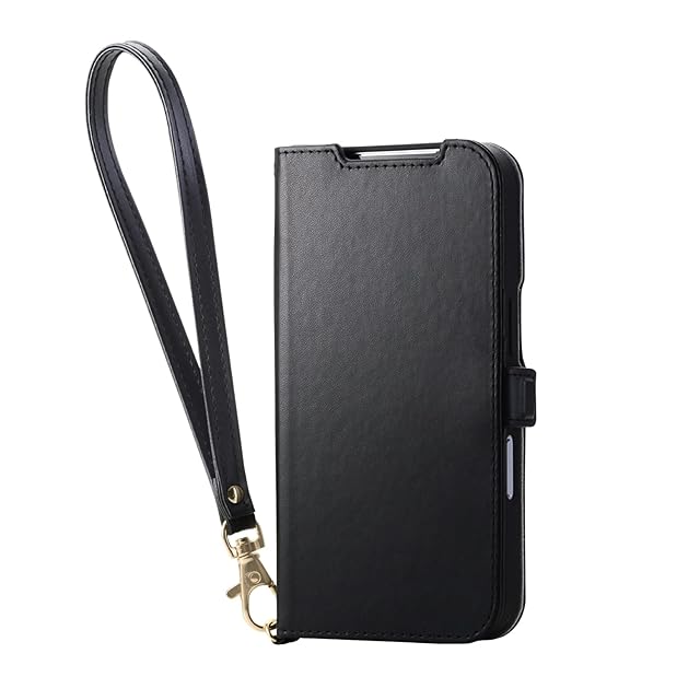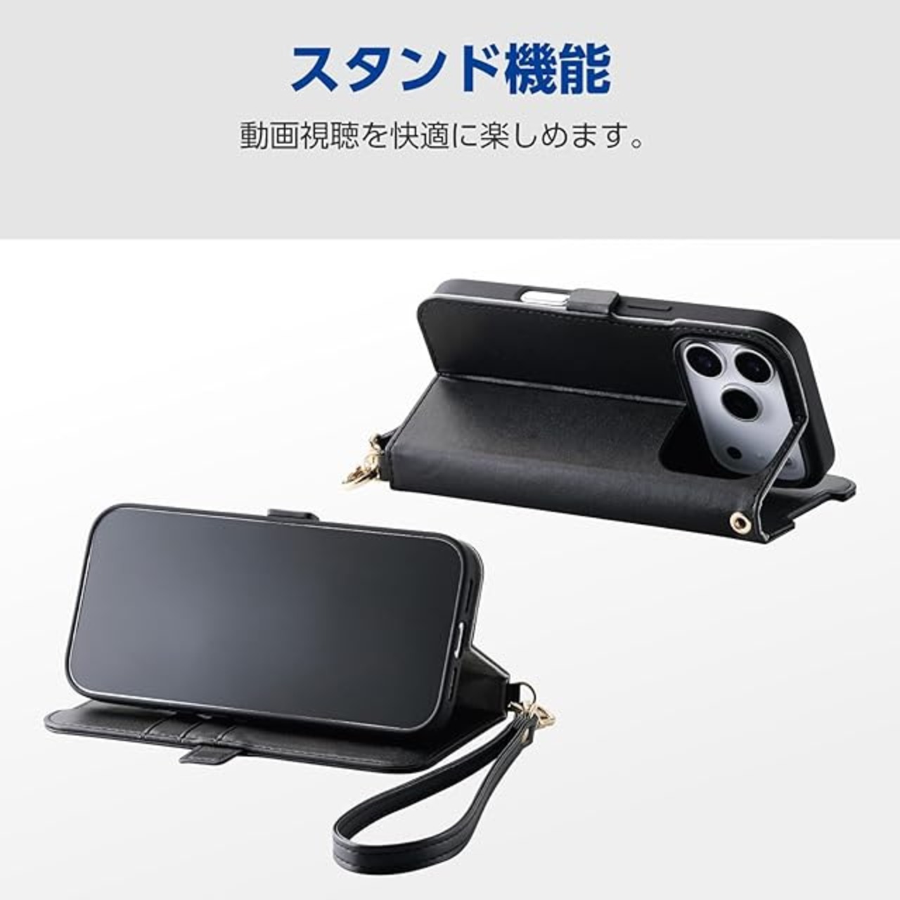 エレコム iPhone 17 Pro ケース カバー 手帳型 ソフトレザー TPU 耐衝撃 衝撃吸収 カード収納 4つのポケット スタンド機能 ハンドストラップ付き 4つ角エアークッション ブラック PM-A25CPLFY4BK | LIS MART